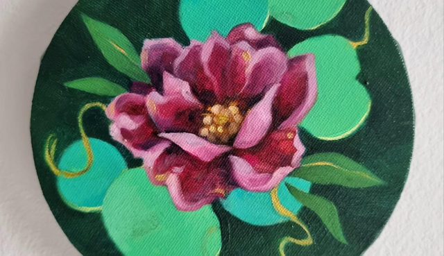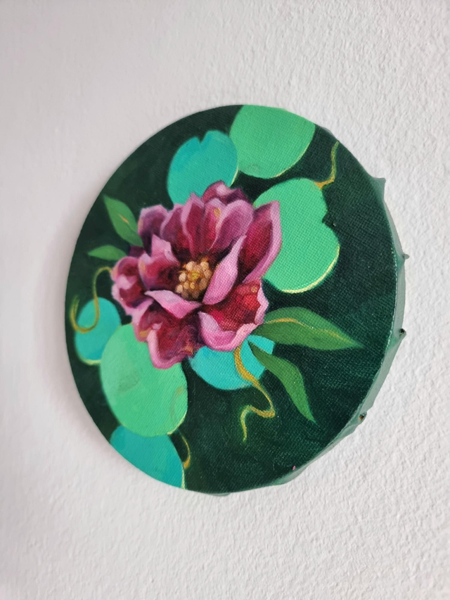 Original flower painting on a circular canvas